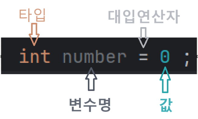 타입, 변수명, 대입연산자, (초기)값 순으로 선언하면 된다.